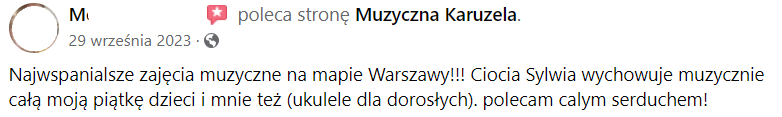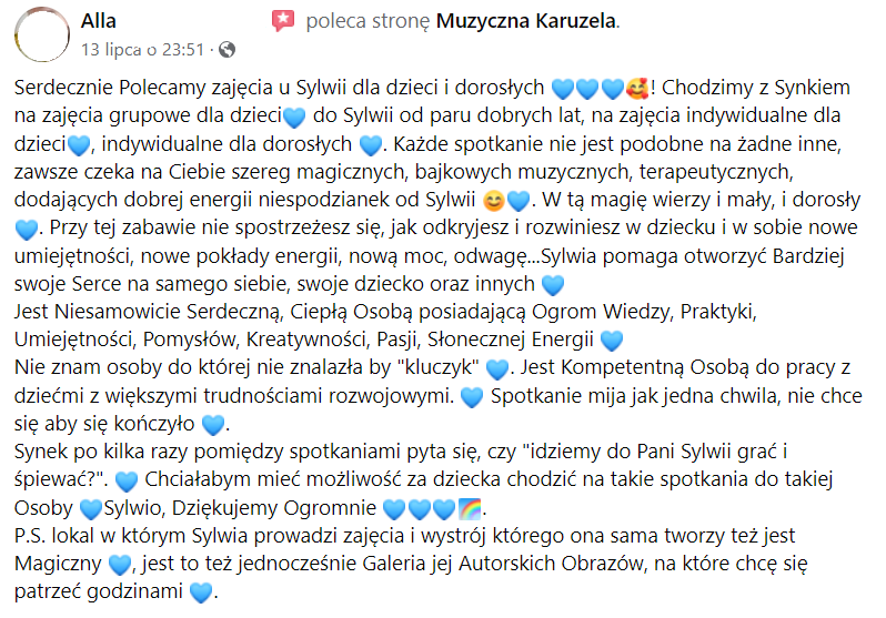 Pani Sylwia to „kobieta orkiestra”. Wszystko co robi ,robi z pasją i daje z siebie 100 a nawet 200 procent. Polecam wszystkim zajęcia w „Muzycznej Karuzeli”. Każdy wyjeździe zadowolony