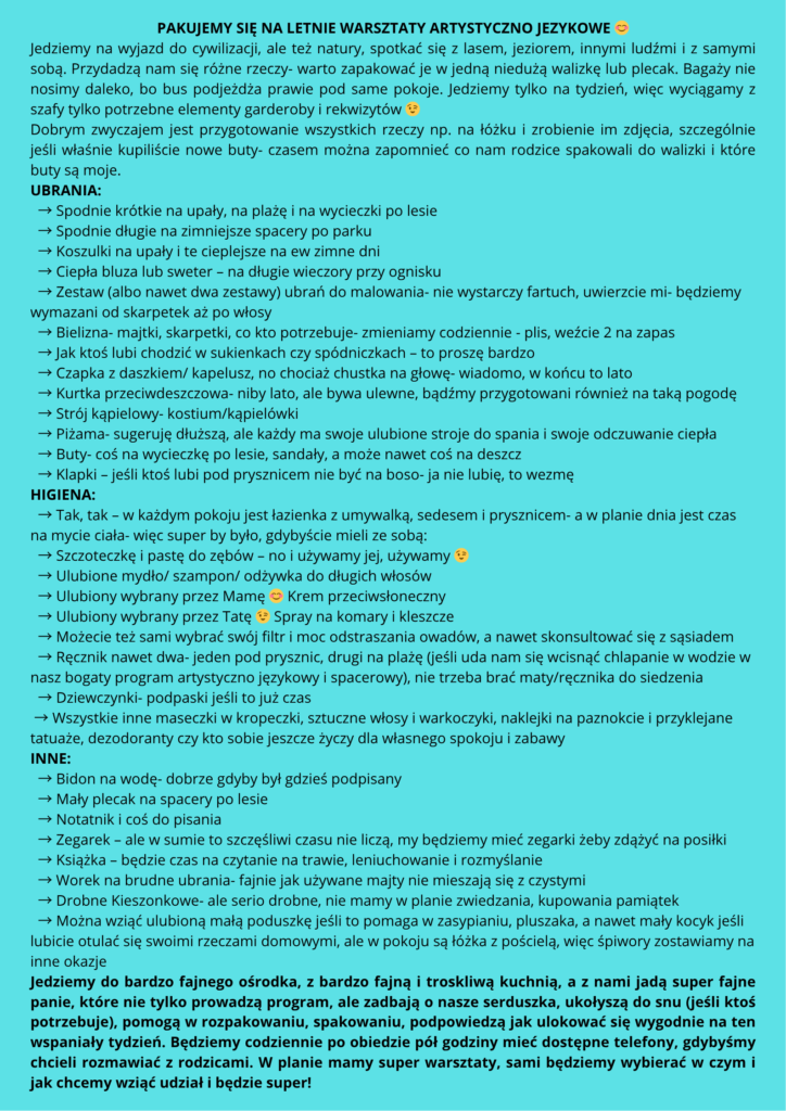 WYJAZD: niedziela 10.08.2025 zbiórka 9:00 ul. Wiślicka 8 (Klub Muzycznej Karuzeli), pakowanie programu i bagaży, wyjazd około 9:30. Kierowca już przyjedzie po badaniu policyjnym. Jedziemy dużym busem i jednym autem (starszaki i pies), mamy zamówioną przyczepę na bagaże, trasa jest na około 4 godziny, zaplanowaliśmy co najmniej 1 długi postój na drugie śniadanie, toaletę i wygłupki integracyjne, ew dodatkowe postoje gdyby dzieci potrzebowały skorzystać z toalety. Bardzo prosimy by dzieci miały na drogę zdrowy prowiant na drugie śniadanie i wodę do picia. W autokarze nie jemy- będzie na to przerwa. Z doświadczenia podpowiem, że dobrze byłoby unikać śniadania mlecznego przed wyjazdem, które często podczas jazdy autokarem jest powodem nudności, a także truskawek i jabłek, które są moczopędne, podczas trasy nie jemy czekolady, chipsów ani gazowanych napojów. Najlepsze są ulubione kanapki i woda, ew woda z sokiem. Można podać dziecku aviomarin, jeśli ma nudności podczas jazdy. W czasie dojazdu dzieci mogą korzystać ze swoich telefonów komórkowych, jeśli ich rodzice na to się zgodzą, my zgadzamy się 🙂 Do ośrodka dojedziemy około godziny 14/15 i tam rozpoczynamy obiadkiem, rozlokowaniem w pokojach i spacerem po okolicy z integracją z grupą.